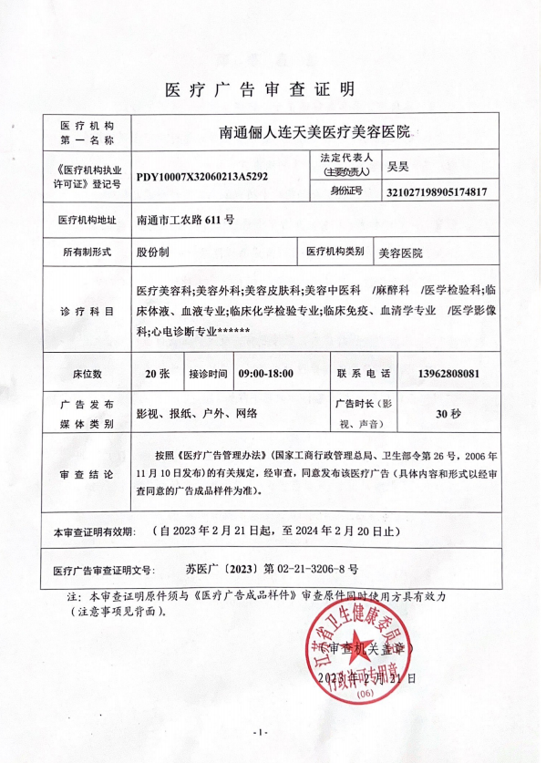 南通儷人連天美醫(yī)療美容醫(yī)院是與著名的醫(yī)療美容集團(tuán)合作建立的醫(yī)院,醫(yī)院提供高品質(zhì)的醫(yī)療美容服務(wù)。2008年,南通儷人連天美醫(yī)療美容醫(yī)院落戶(hù)南通,成為由南通衛(wèi)生局審批的專(zhuān)業(yè)醫(yī)療美容醫(yī)院。南通儷人連天美醫(yī)療美容醫(yī)院,特別設(shè)有專(zhuān)業(yè)的整形美容科、皮膚美容科和微創(chuàng)美容科三大科室,致力于為廣大求美者提供全方位的醫(yī)療美容服務(wù)。南通儷人連天美醫(yī)療美容醫(yī)院為求美者建立個(gè)人終生美麗檔案,一對(duì)一進(jìn)行細(xì)致服務(wù)。 11年來(lái),南通儷人連天美醫(yī)療美容醫(yī)院,不斷引進(jìn)先進(jìn)設(shè)備,不斷完善醫(yī)美技術(shù),一批優(yōu)秀、專(zhuān)業(yè)而穩(wěn)定的醫(yī)生團(tuán)隊(duì),為無(wú)數(shù)求美者鑄就美麗夢(mèng)想。